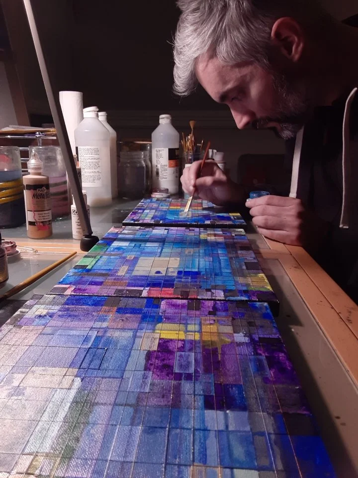 Rial’s passion for the arts led to a career in digital media, graphic design, marketing, and nonobjective art. He is the founder and creative director of Animorum, a creative communications firm based in Omaha. He started painting on larger canvas in 2015 and exhibiting in 2021. His works are inspired by geometry, stained glass, icons, maps and hope. He believes that visual art is an important part of design and public space beautification efforts. He seeks to elevate public and private environments through his creations. His impactful designs invoke feelings ranging from calm order to dynamic excitement. He attended the University of Nebraska Omaha, College of Communication, Fine Arts, and Media, and Metropolitan Community College (Nebraska), focusing on Fine Arts and Graphic Design.
